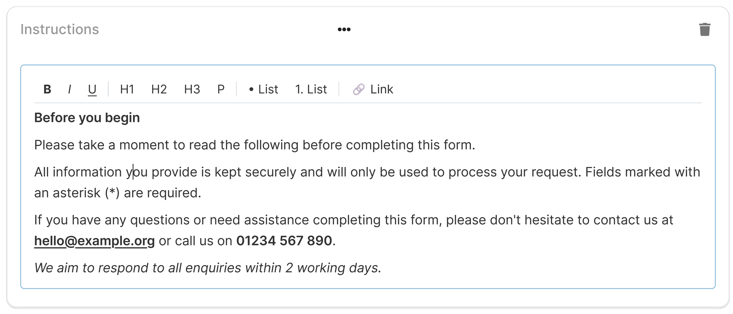 Yes! Finally! You can now use rich text formatting — headings, bold, bullet points, links and more — in mailouts, form instruction blocks, and checkbox labels. That last one is a particular favourite: link directly to your terms and conditions right from the checkbox label, exactly as it should be. Properly formatted content, everywhere you need it.